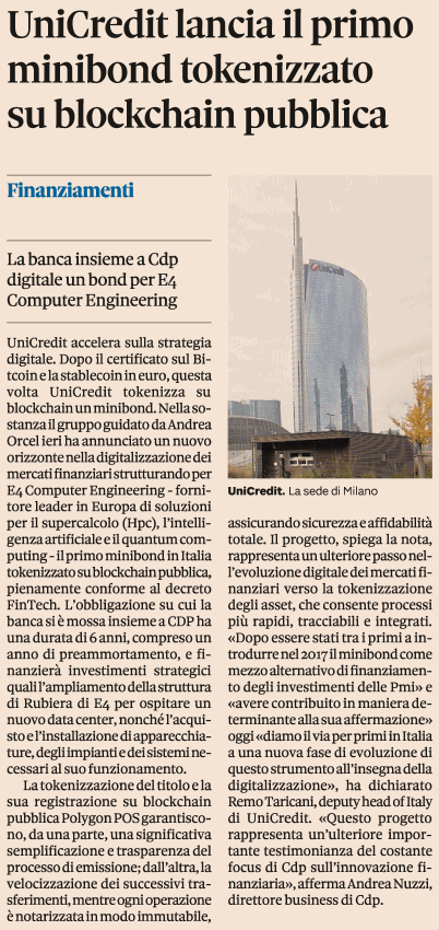 UniCredit lancia il primo minibond tokenizzato su blockchain pubblica